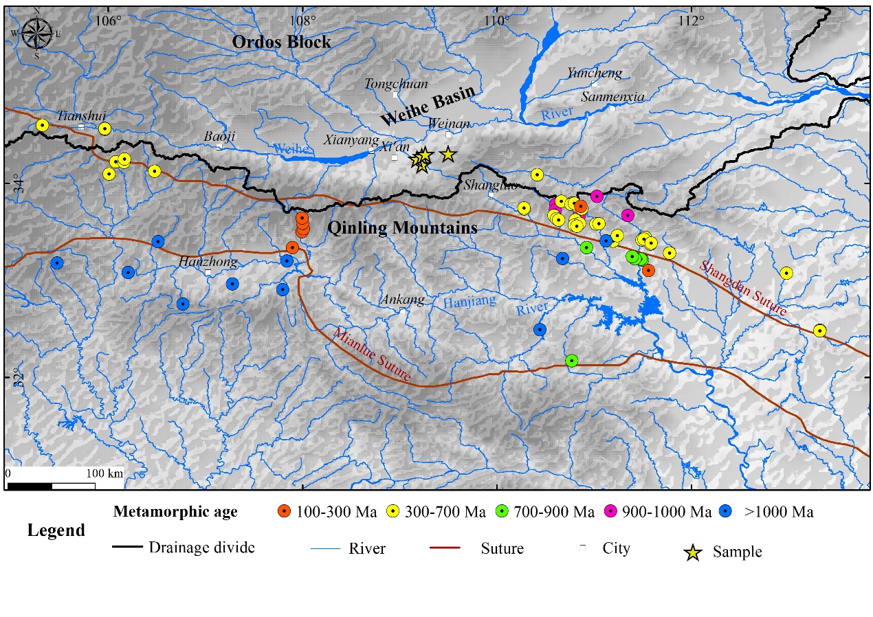 分水岭迁移对构造过程和气候变化的响应敏感,对地貌过程、河流形态及沉积物传输有重要影响。分水岭迁移是一个长期动态过程,在自然条件下难以直接观察。以往研究多采用模拟手段,鲜有典型地质地貌实例。秦岭地区新构造活动强烈,是中国南北气候的分界带。秦岭造山带发育诸多近东西走向不同时代的变质岩带,山前盆地中堆积了连续的新生代沉积,记录了长时间尺度山体剥蚀、河流侵蚀和搬运历史(图1)。本研究通过分析渭河盆地沉积序列中碎屑金红石U-Pb年龄分布揭示的物源变化,探讨新生代秦岭南北流域分水岭迁移过程,提供了理解新生代以来构造-气候相互作用下中国中部地貌演变的新案例。
