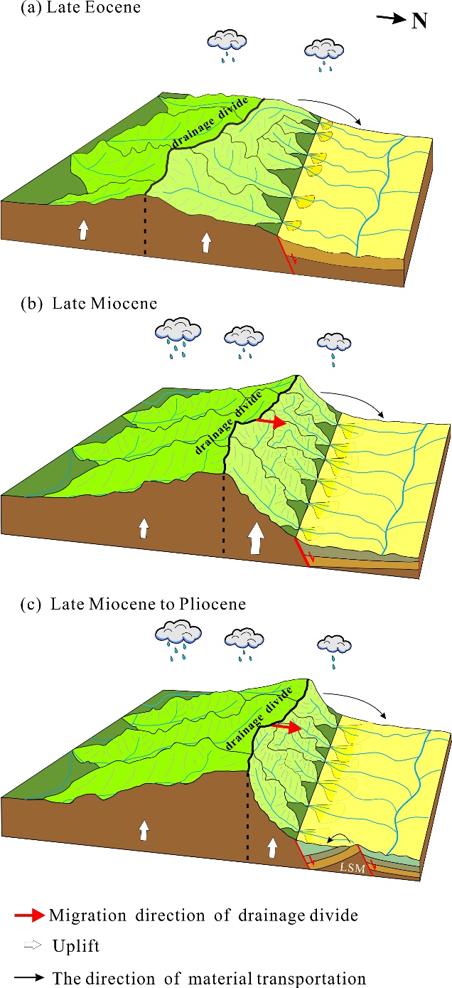 晚中新世以来,秦岭分水岭向北迁移可能受到北秦岭快速隆升和区域气候逐渐变干的共同驱动。随着山脉在晚中新世的生长,形成了大气环流的地形屏障,阻挡了北上的水汽,导致秦岭分水岭两侧的气候条件显著差异,产生 “雨影效应”。其中隆升量较小的分水岭南侧降水较多,而隆升量较大的分水岭北侧降水较少。因此,分水岭北侧河流的径流量减少,河流的侵蚀速率降低,使秦岭分水岭在长时间尺度下向高抬升速率/干旱一侧(北侧)迁移。