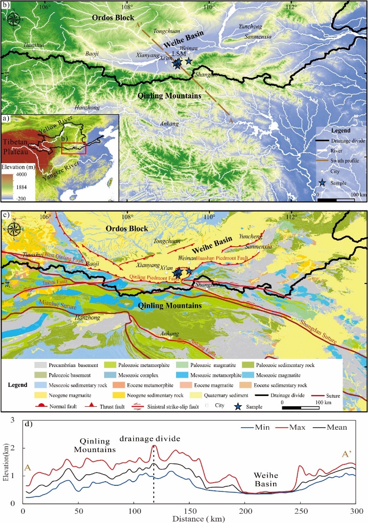 图1 研究区构造背景及地形特征。(a)秦岭及周边地区地形图。(b)秦岭和渭河盆地地形及水系。(c)秦岭山脉-渭河盆地地质图。(d)秦岭-渭河流域盆山系统地形条带剖面,条带状剖面的宽度为10 km。