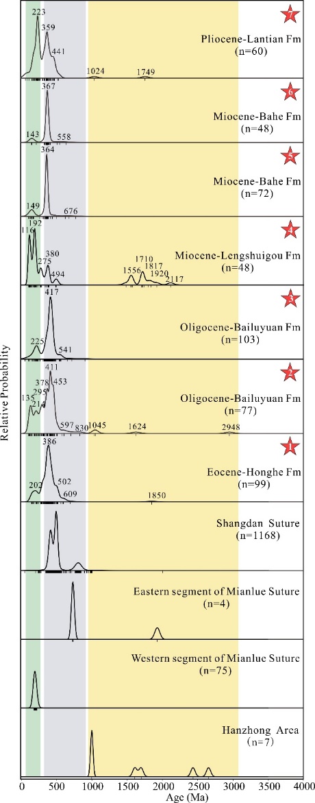 本研究通过对秦岭山前渭河盆地内新生代地层的碎屑金红石U-Pb年代的测试,并将其与秦岭源区的变质年龄进行对比,推断新生代以来秦岭分水岭的迁移过程。结果显示,始新世至早中新世,红河组至冷水沟组沉积物的碎屑金红石U-Pb年龄峰值主要分布于110-300 Ma、350-680 Ma、800-840 Ma、1000-2500 Ma及2500-3000 Ma(图2)。此时,渭河盆地沉积中的金红石可能来自勉略缝合带西段、商丹缝合带及现今分水岭以南的汉中地区(图3);秦岭南北分水岭可能位于南秦岭。晚中新世灞河组沉积物的碎屑金红石U-Pb年龄峰值变化为150 Ma和400 Ma(图2),其源区可能为勉略缝合带西段和商丹缝合带(图3)。这表明秦岭南北分水岭此时在向北迁移。上新世蓝田组沉积物的年龄峰值主要分布在110-300 Ma、350-680 Ma及少量1000-2500 Ma(图2),源区可能为勉略缝合带西段和商丹缝合带变质带,以及始新世和渐新世地层再循环沉积(图3)。