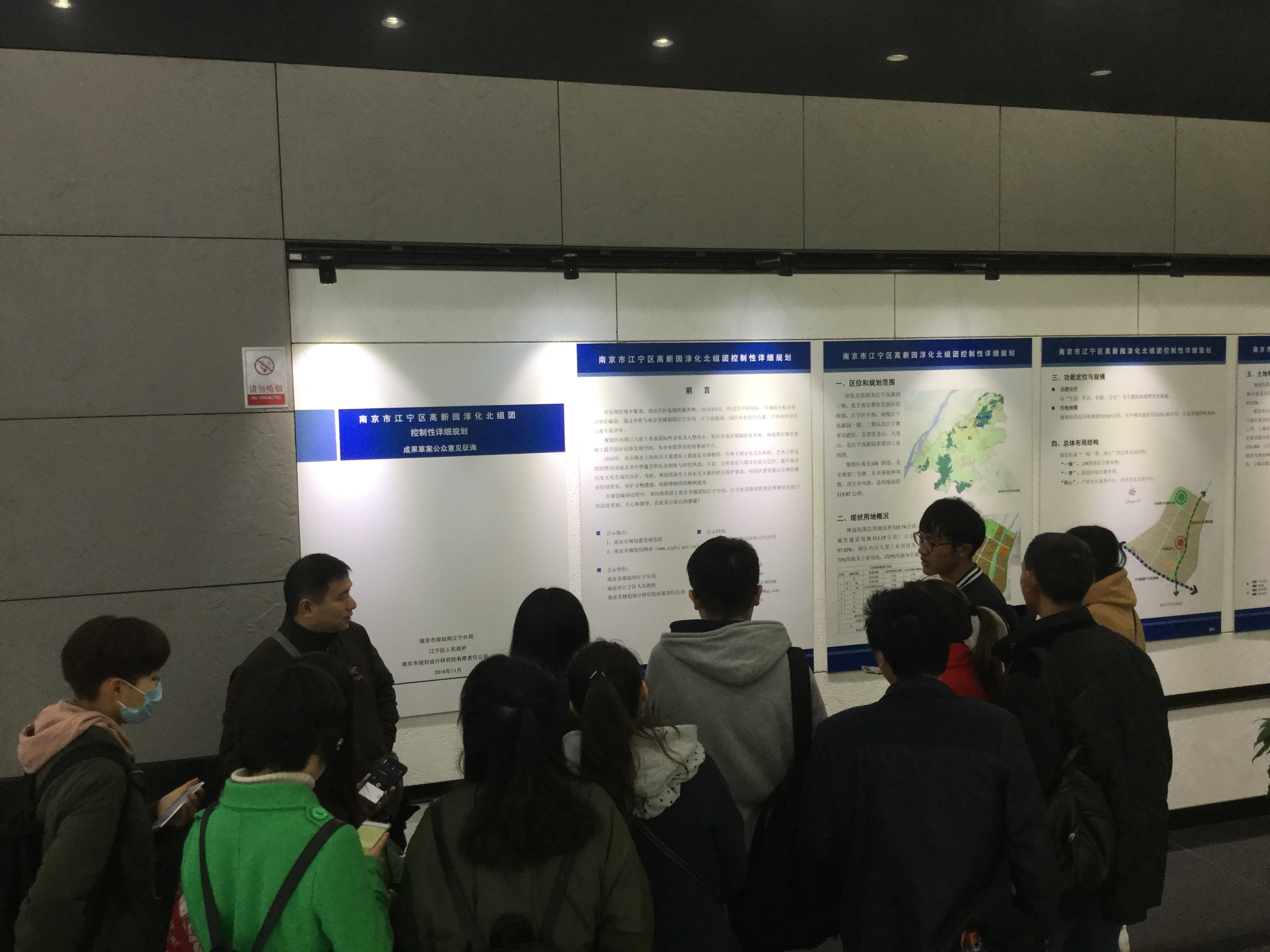 在三层展厅,张翔老师为大家详细讲解了南京各区的规划建设:栖霞区龙潭新城这座卫星城存在的意义是缓解主城人口过于集中的问题;坐落在建邺区的城市地标——奥体中心,造型精巧,是典型的后现代建筑;通过江宁区高新园淳化北组团的例子,大家认识到各类型的用地须遵循一定的比例,在城市紫线范围内的土地利用模式应以绿地为主,建筑必须协调。