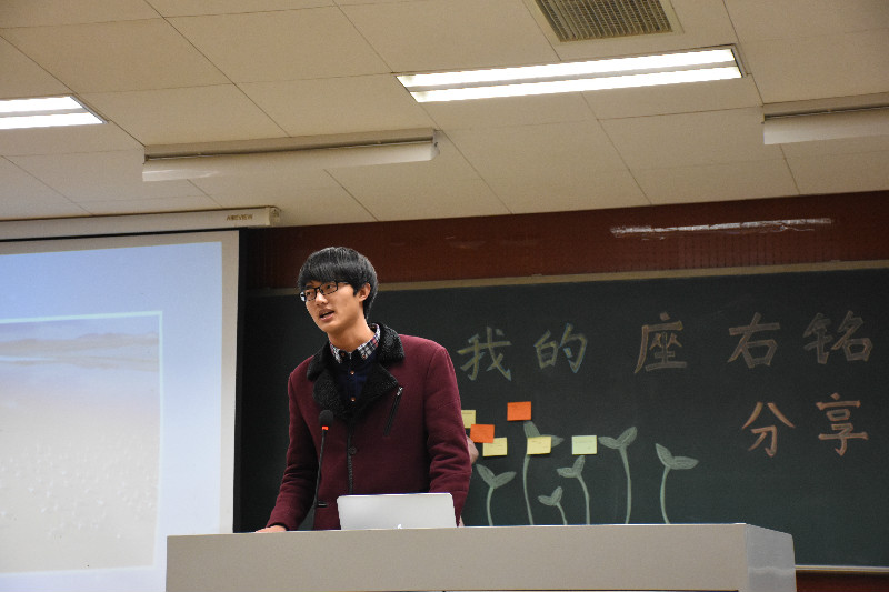 紧接着大二的年级长罗奥学长以一种轻松随和的语调为大家介绍了他别致却在理座右铭——不揽事儿,期望以此来提醒自己最容易忘记的事。他直言,自己最容易忘记的事是目标,而总是有非常多的事找上来,为了让自己实现目标,他则不去揽那些无所谓的事,一直朝自己的目标前进。