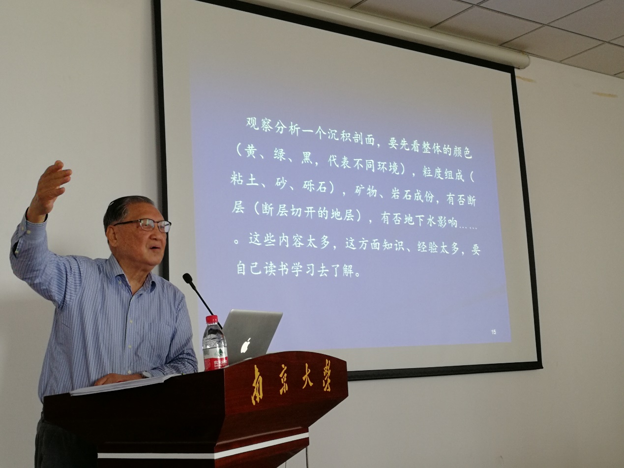 朱大奎教授作报告“怎么做野外工作与怎么读书”:结合亲身实例讲述野外工作前需做好资料、图件、仪器、路线等准备工作;野外工作中注意观察、剖面分析、野外笔记记录规范性等问题;室内整理分析研究工作是求证事先的设想,是水到渠成的工作。同时,强调大学学习要有国际视野,多参加不同系科的学术活动,还通过国内外著名地理学家、海洋学家的科学故事来阐明读书要思考、要研究、要创造。在掌握基础知识前提下,结合野外工作、研究工作读书效果最好。