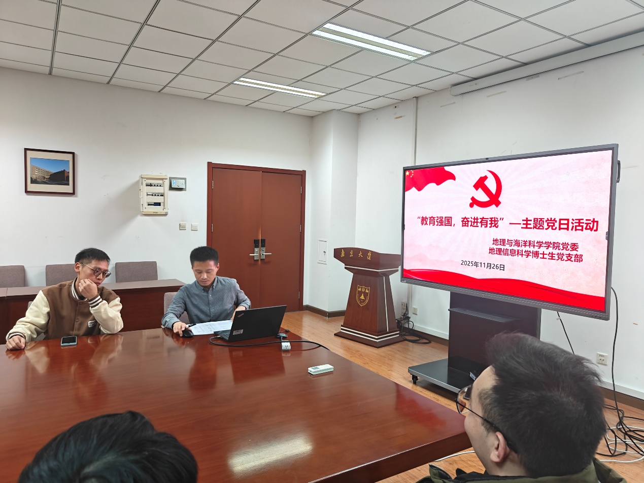 2025年11月26日,中共bl动漫 地理信息科学博士生党支部举办“教育强国,奋进有我”主题党日活动。本次活动以深入学习贯彻习近平新时代中国特色社会主义思想为主线,紧密围绕党的二十大及二十届四中全会精神,结合地理信息科学、遥感科学等学科特色,引导青年博士生党员坚定理想信念、恪守科研诚信、服务国家战略。