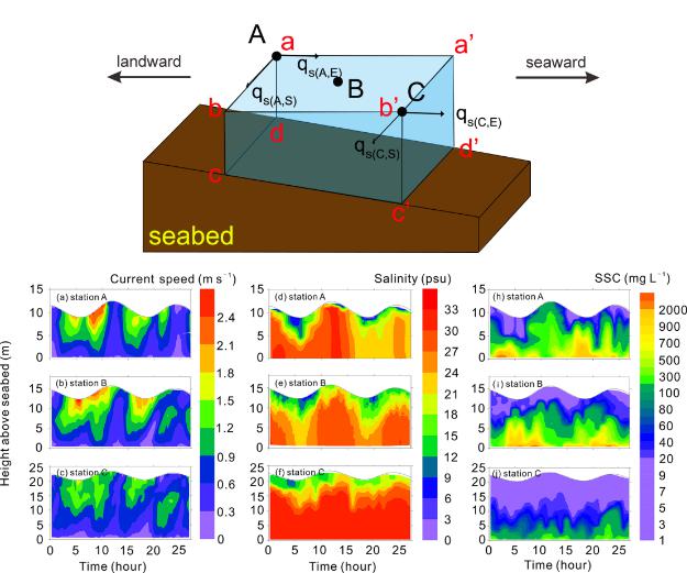 河口是指河流入海处的半封闭水体,其盐度因陆地径流掺入而显著淡化。这里是地圈、水圈和大气圈交互作用、人类活动影响剧烈的关键带;河口细颗粒泥沙常吸附有机质、影响水体透明度,其输运过程对河口地貌、生态系统有着深刻的影响。悬沙浓度是刻画细颗粒沉积物的关键指标,平流输运与再悬浮作用是影响悬沙浓度变化的重要因素,因此评估这两种作用有助于对悬沙输运过程、地貌演化的解释。在数学模型中,这两项可由不同的数学表达直接获得。但在实测悬沙浓度变化的时间系列中,将平流输运与再悬浮作用进行定量化分离是难点。课题组在长江口南槽口外海域的三个站位进行野外现场观测和实验,结合室内样品分析,获得了潮周期内的水位、流速、悬沙浓度、盐度、海底切应力等数据。在此基础上,建立了一个假想的盒子模型(见下图),将水体悬沙浓度成功分离为平流输运组份与再悬浮组份,并基于海底冲淤测量验证了盒子模型的可靠性;采用数值模拟方法,进一步论证盒子模型的适用范围。