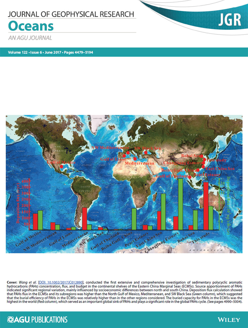 bl动漫 、海岸与海岛开发教育部重点实验室的邹欣庆教授课题组有关我国近海环境中多环芳烃(PAHs)环境行为方面的研究获得重要进展,相关成果以“Distribution pattern and mass budget of sedimentary polycyclic aromatic hydrocarbons in shelf areas of the Eastern China Marginal Seas”为题,以封面论文形式(图1)发表在著名地学综合性刊物《Journal of Geophysical Research: Oceans》上(J. Geophys. Res. Ocean. (2017).122, (6): 4990-5004.)。该论文的第一作者为bl动漫 2017级博士研究生王成龙,通讯作者为邹欣庆教授。