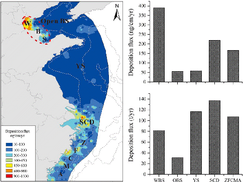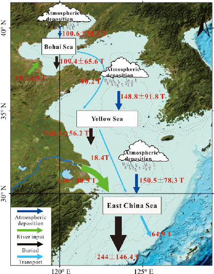 本研究是对该领域前期成果的进一步深化,以我国东部陆架海域表层沉积物中PAHs浓度数据为基础,结合研究区沉积物粒度、有机碳含量以及区域海洋动力条件等资料(图2),首次获取了整个中国东部海域表层沉积物中PAHs的分布模式,并探究了其可能的影响因素。此外,本研究以沉积过程为基础,估算了研究区PAHs的年沉降通量,并进一步结合物质守恒原理建立了研究区PAHs的收支平衡。研究结果表明,研究区PAHs分布特征主要受区域动力条件以及沉积物理化特性(粒度、有机碳含量、沉积速率等)的影响,PAHs高值区主要分布在泥质沉积区;源解析结果显示研究区多环芳烃的来源具有明显的空间差异,这与我国南北社会经济结构的差异有关(图3);研究区PAHs的埋藏通量处于11.2-1308 ng cm-2 yr-1,平均埋藏通量约为101±104 ng cm-2 yr-1,研究区范围内的年埋藏通量约为494 t;收支平衡研究表明(图4),PAHs主要来源于河流径流和大气沉降,分别贡献了PAHs总入海通量的28.4%和71.6%,每年约有10.2 t的PAHs通过水流交换由渤海输入到黄海海域;此外,在东海陆架跨陆架输运的作用下,约有21%左右的入海PAHs被输送到外陆架区域。该项研究全面深入的探讨了我国东部陆架海域表层沉积物中PAHs的分布模式和收支平衡,可以为边缘海PAHs的环境行为提供研究范例,也可为我国近海PAHs污染防治以及生态系统健康评价提供决策参考和理论支撑。