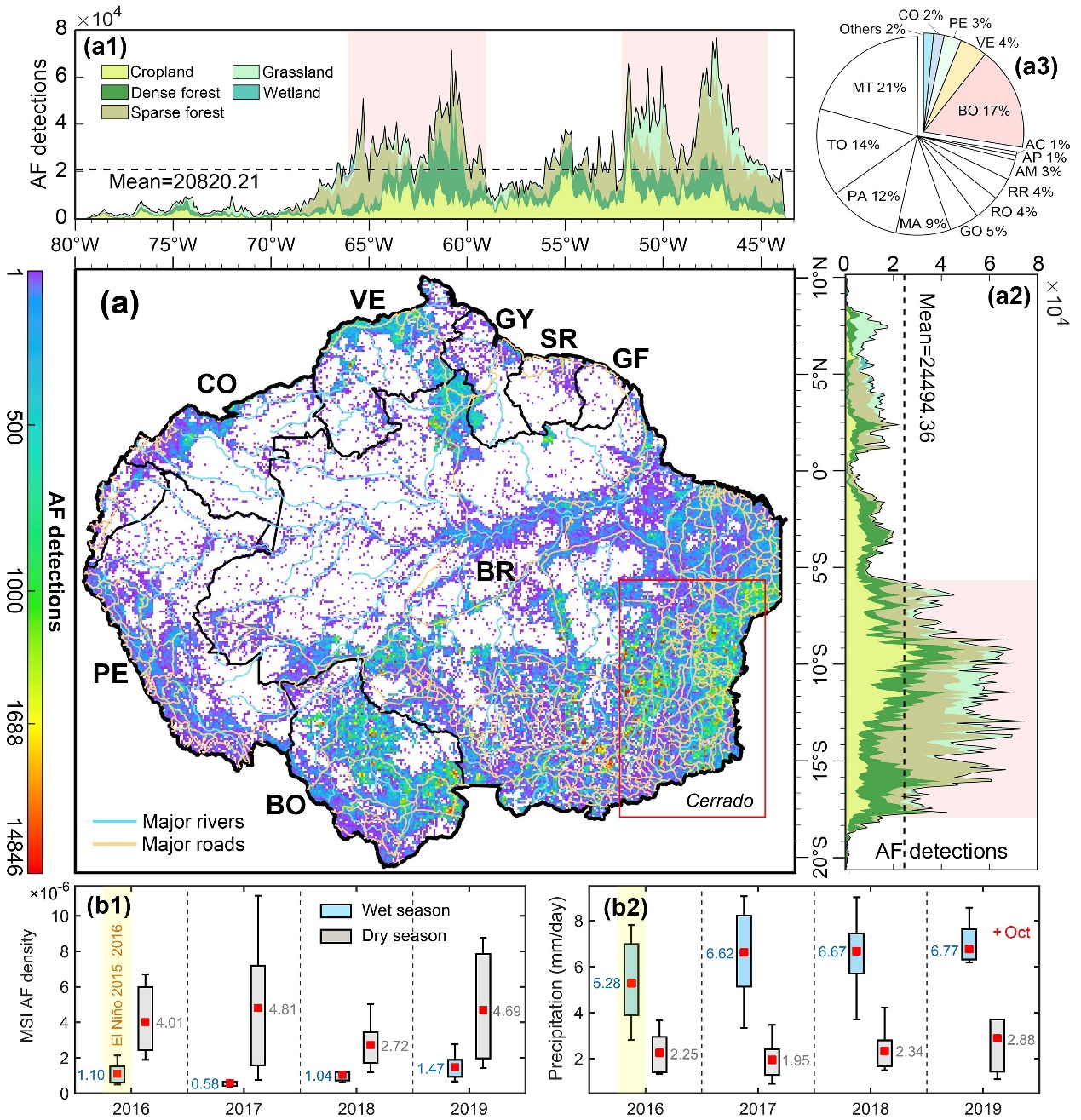图2 亚马逊地区的火灾的时空动态(2016–2019年)。(a)亚马逊地区火点探测的空间格局(0.1°× 0.1°),生物质燃烧类型随纬度/经度的变化分别显示在(a1)右侧和(a2)顶部;(a3)亚马逊地区各行政单元内的火点检测占比。(b)研究时段内亚马逊地区旱季(6–10月)和湿季(11月–次年5月)的火点密度与对应降水量的变化。