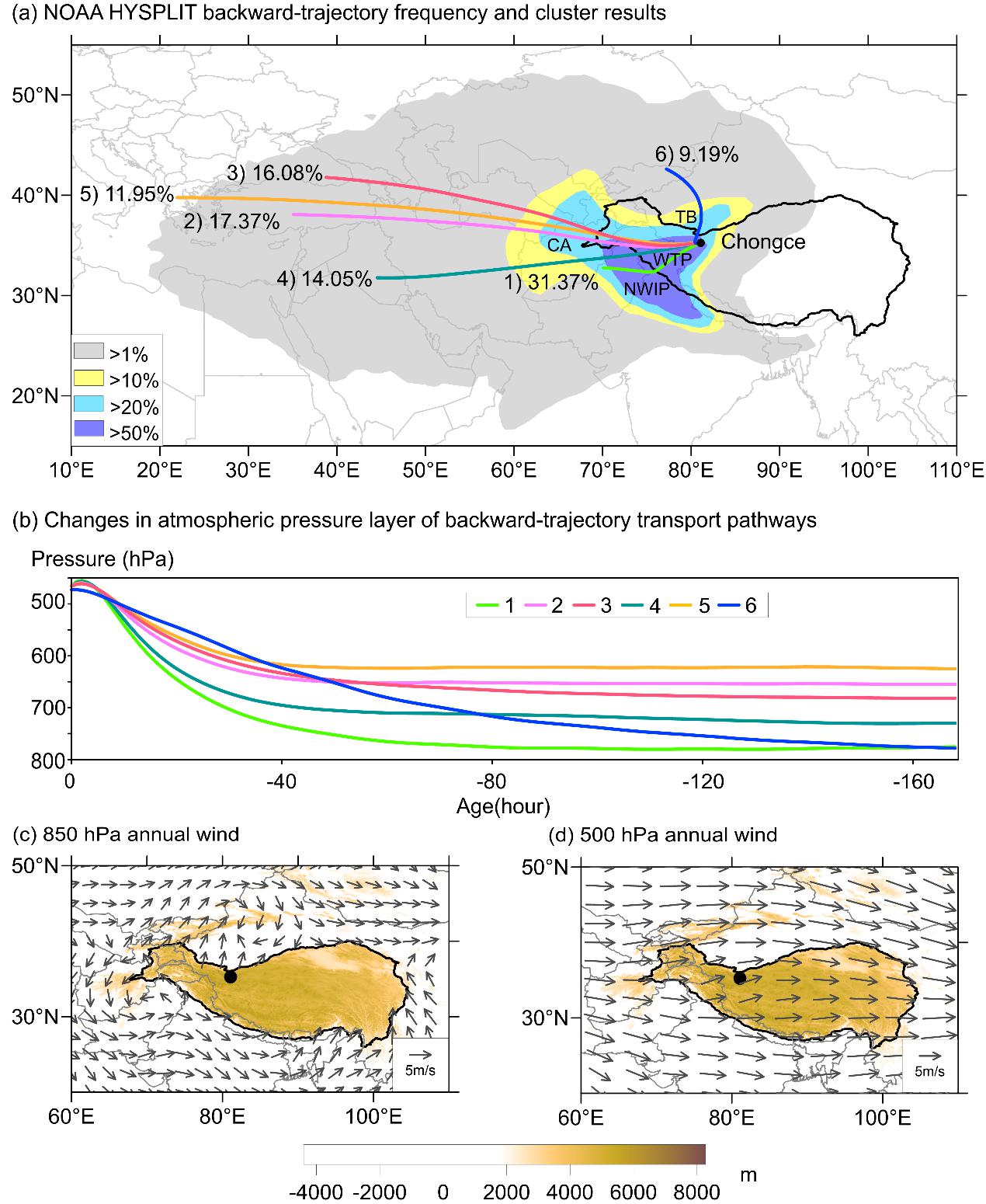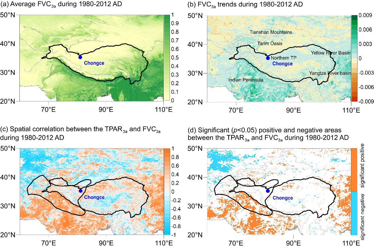 本研究提取了青藏高原西部的崇测冰芯上部30.5m样品的高分辨率的花粉积累率记录 (图1),基于后向轨迹、风场和地形强迫分析,研究确定了崇测冰芯花粉的潜在源区、传输机制和传输路径 (图2)。根据3年分辨率的崇测冰芯总花粉积累率 (the 3-year total pollen accumulation rate, 简称TPAR3a) 和3年分辨率的植被覆盖度 (the 3-year fractional vegetation cover) 数据的良好相关性,确定TPAR3a是崇测源区植被覆盖度的良好指标 (图3)。综合研究表明,青藏高原西部及其周围地区的绿化早在公元1935年就开始了,其主要原因是区域暖湿化。20世纪70年代以后,绿化趋势变得更加显著,这主要归因于温度的显著上升 (图4)。