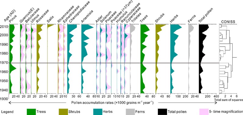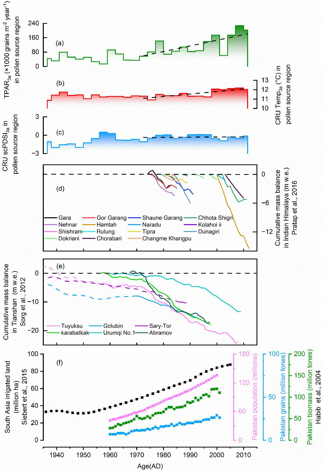 长期卫星记录显示,至少自1981年以来,全球植被覆盖地区开始绿化。然而,这一趋势存在显著的空间和时间差异。因此,收集不同地区和不同时期的植被动态信息对于了解植被变化的总体动态尤为重要。作为研究植被动态的重要数据来源,遥感数据的时间覆盖面有限,只能追溯到1980年代左右。为了探索公元1981年之前的植被变化,需要替代方法来重建植被历史。先前的研究表明,花粉累积率 (pollen accumulation rate, 简称PAR) 在重建植被覆盖和植物生物量方面具有巨大的潜力。因此,本研究旨在探索PAR和植被覆盖度之间的关系。近年来,冰芯花粉研究以其高时间分辨率和准确定年等特点,在大空间尺度的植被、土地利用和气候重建方面显示出其独特优势。尽管之前在青藏高原上曾开展过冰芯花粉的研究,但是仍然缺乏花粉与植被绿度关系的探究。