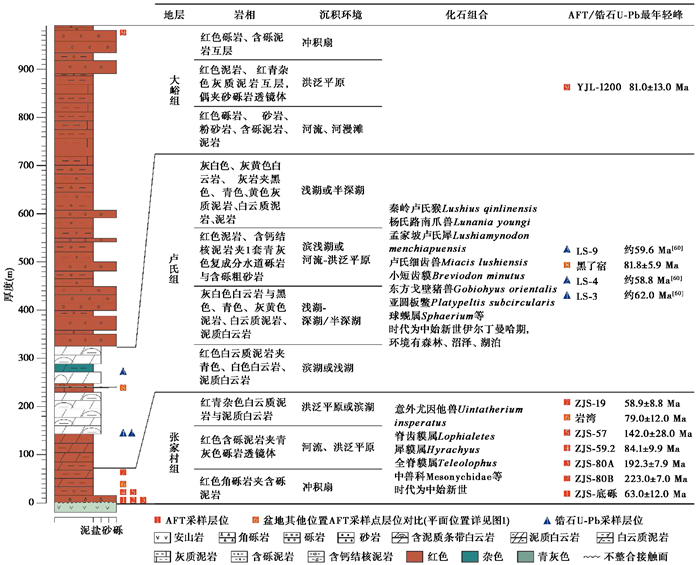 以博士生邵可涵为第一作者的论文(图3),对卢氏盆地保存的>1000 m厚的连续的始新世河湖相沉积物(从下到上分为张家村组、卢氏组和大峪组),进行了沉积特征、年代和环境记录的综合研究。结果表明:1)碎屑磷灰石裂变径迹与碎屑锆石U-Pb年龄指示沉积序列年代晚于约60 Ma,与前人将张家村组-卢氏组化石组合对比到中始新世的结论基本吻合。2)始新统张家村组沉积相演化表现为冲积扇→河流→洪泛平原或滨湖,反映盆地拉张、初期成湖的过程;卢氏组为滨浅湖→深湖/半深湖→滨浅湖或洪泛平原→浅湖/半深湖,反映湖泊开始稳定出现后的扩张、收缩和复活过程;大峪组为河流→洪泛平原→冲积扇,反映湖泊淤满消亡后河流与冲洪积物相继充填的历史。3)沉积相、化石组合、盐类矿物种类揭示中始新世卢氏盆地古气候为半湿润半干旱,地表景观呈现径流活跃、动物种类多样、树木茂盛、发育淡水至微咸水湖的特征,并可能具有一定的季节性。以硕士生吕帆为第一作者的论文,对卢氏盆地中始新世河湖相沉积展开沉积学与物源分析,测试了27个层位的碎屑锆石U-Pb年龄。他们认为,张家村组、卢氏组沉积物主要来自于相对远源的北秦岭造山带和南秦岭造山带。大峪组下部物源转变成以近源的北秦岭造山带和华北克拉通南缘两个构造单元为主。大峪组上部地层沉积环境转变为冲积扇,可能与东南方栾川地区晚中生代花岗岩的抬升-剥露有关。卢氏盆地中始新世河湖相沉积序列揭示了卢氏古湖从形成到消亡的过程和山-盆地貌侵蚀、搬运和堆积的历史,并记录了秦岭山脉两期区域隆升事件。以硕士生高鑫为第一作者的论文,认为卢氏盆地中始新世湖相沉积物物质组成以碳酸盐、粘土和粉砂为主,其中碳酸盐沉积为表生条件下封闭或半封闭淡水湖或微咸水湖化学作用自生成因。他们使用傅里叶红外光谱(FTIR)漫反射法测定沉积物碳酸盐含量,发现其与磁化率具有一定的负相关关系,分别指示了内源化学沉积和外源碎屑输入的贡献量,受控于流域蒸发量与降水量的共同作用,揭示了中始新世卢氏盆地的干湿变化。当流域更加湿润,即降水量增加(蒸发量减少)时,径流量相应增加,不利于碳酸盐沉淀而有利于外源碎屑输入,表现为沉积物碳酸盐含量降低、磁化率数值升高。在已有年代框架的基础上,他们建立了卢氏盆地湖相沉积物碳酸盐含量时间序列,记录了在中始新世气候适宜期(MECO)卢氏盆地较为湿润的气候环境,并且具有多旋回变化,可能与地球运动轨道的周期变化相关。