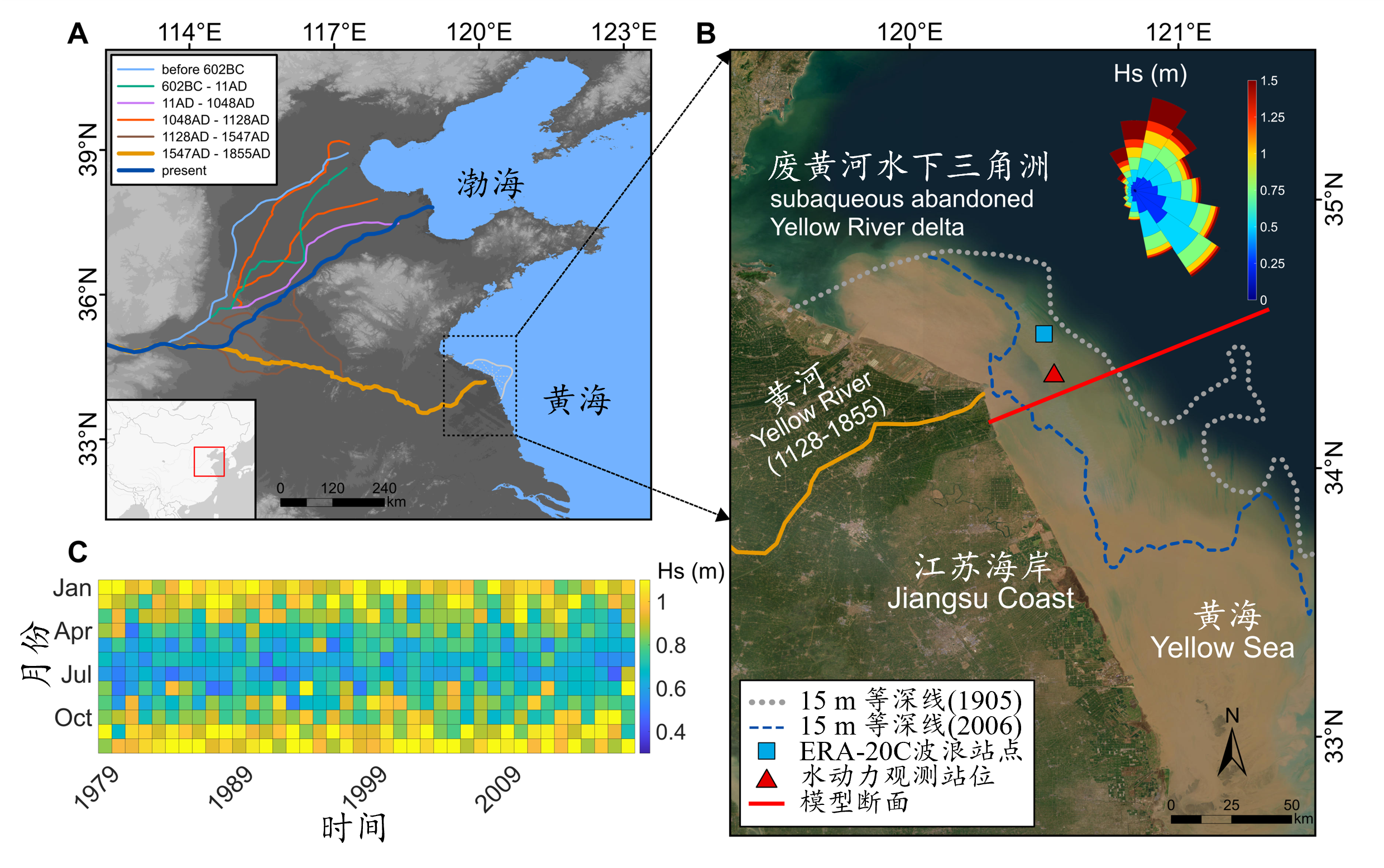 图1. 江苏北部废黄河三角洲及野外观测站位。 图1A为黄河历次改道示意图,图1B为研究区野外观测站位分布,图1C为研究区有效波高(Hs)季节性分布。