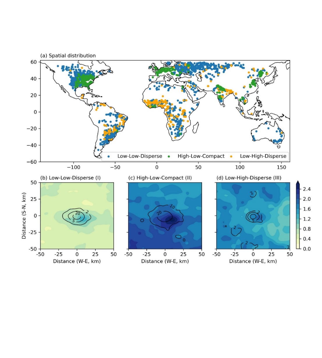 图1 (a)三种城市扩张方式:类型I:城市覆盖度低、城市化速率低、城市布局离散;类型II:城市覆盖度高、城市化速率低、城市布局紧凑;类型III:城市覆盖度低、城市化速率快、城市布局离散。(b-d)降雨异常空间分布。第二种紧凑型城市扩张在城区及附近地区产生了较大的降雨增加;而另外两种增加不明显,其中第三种离散型的快速城市扩张,降雨增加主要集中在郊区。
