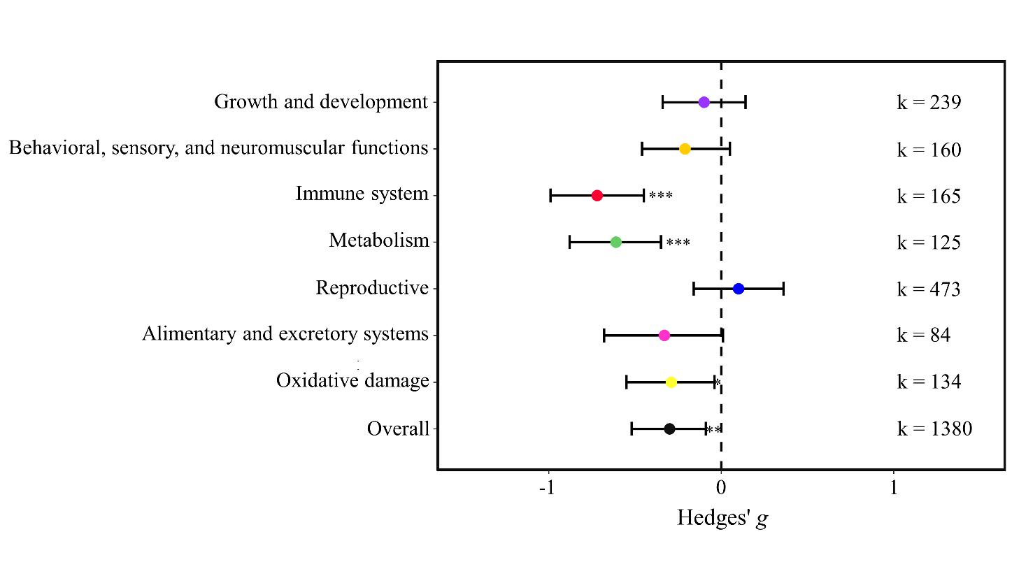 在此背景下,bl动漫 邹欣庆教授团队选择鱼类为目标研究对象,溶解态为污染物存在形式,进行了一项荟萃分析,定量总结全球文献中现有的实验证据,并使用效应大小估计器来确定毒性的变化(方向和大小)以及对生物功能和系统的影响。研究发现在环境MP浓度的背景下,共存污染物溶液中MP的存在显著增加了对鱼类的毒性,具体而言,MPs会增加对免疫系统、代谢和氧化损伤的负面影响,但对生长和发育、行为和感觉及神经肌肉功能、消化和排泄系统、繁殖没有显著影响(图2)。此外,通过亚组/元回归分析探讨可能影响毒性的因素,发现毒性的变化与鱼类的生长阶段和MP大小有关,但与共存污染物类型、MP类型、有机污染物的logKow、暴露时间无关(图3)。最后,从MPs、共存污染物、环境因素和实验对象四个方面讨论了实验室研究与实际水生环境的差异,这些差异可能会影响评估的准确性。本研究为从复合污染的角度进一步了解MPs对水生生物的潜在影响提供了基础。此外,鉴于污染是渔业资源减少的重要因素,本研究可以为水生生态系统的保护和管理提供参考。