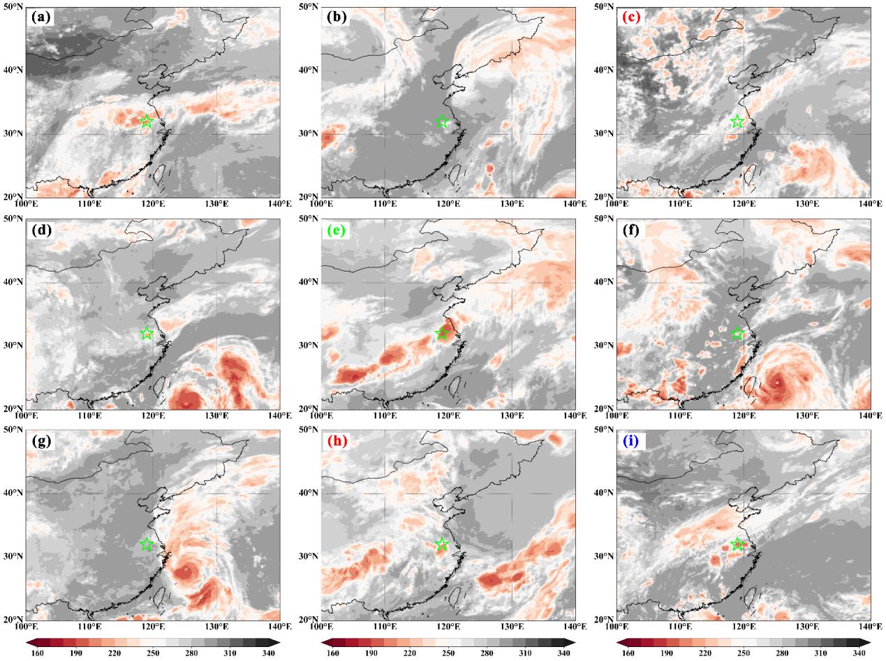 图2:2013-2021南京短时强降水事件期间小时尺度卫星相当黑体温度的空间分布