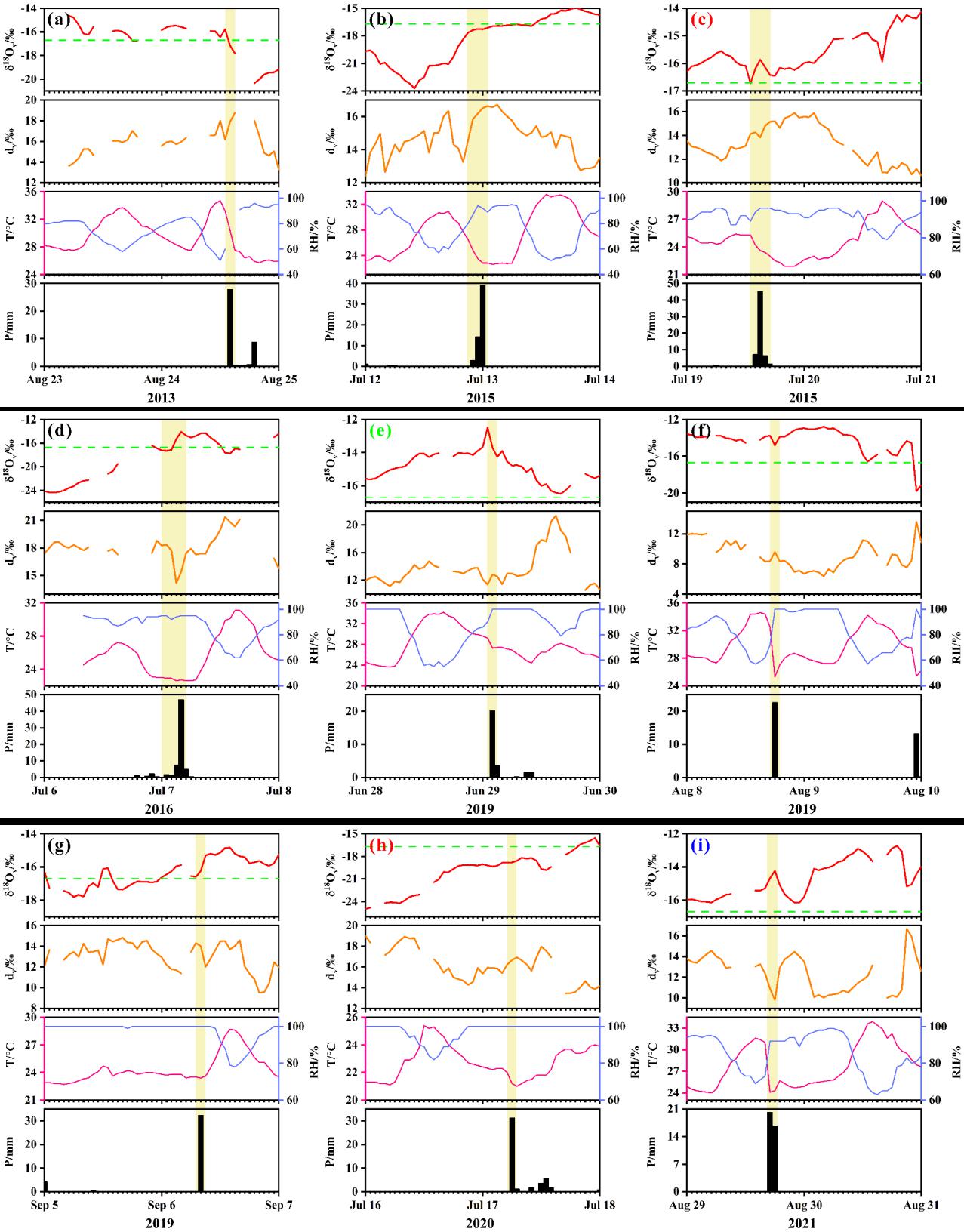 图1:2013-2021南京短时强降水事件期间小时尺度水汽稳定同位素组成和气象要素变化特征