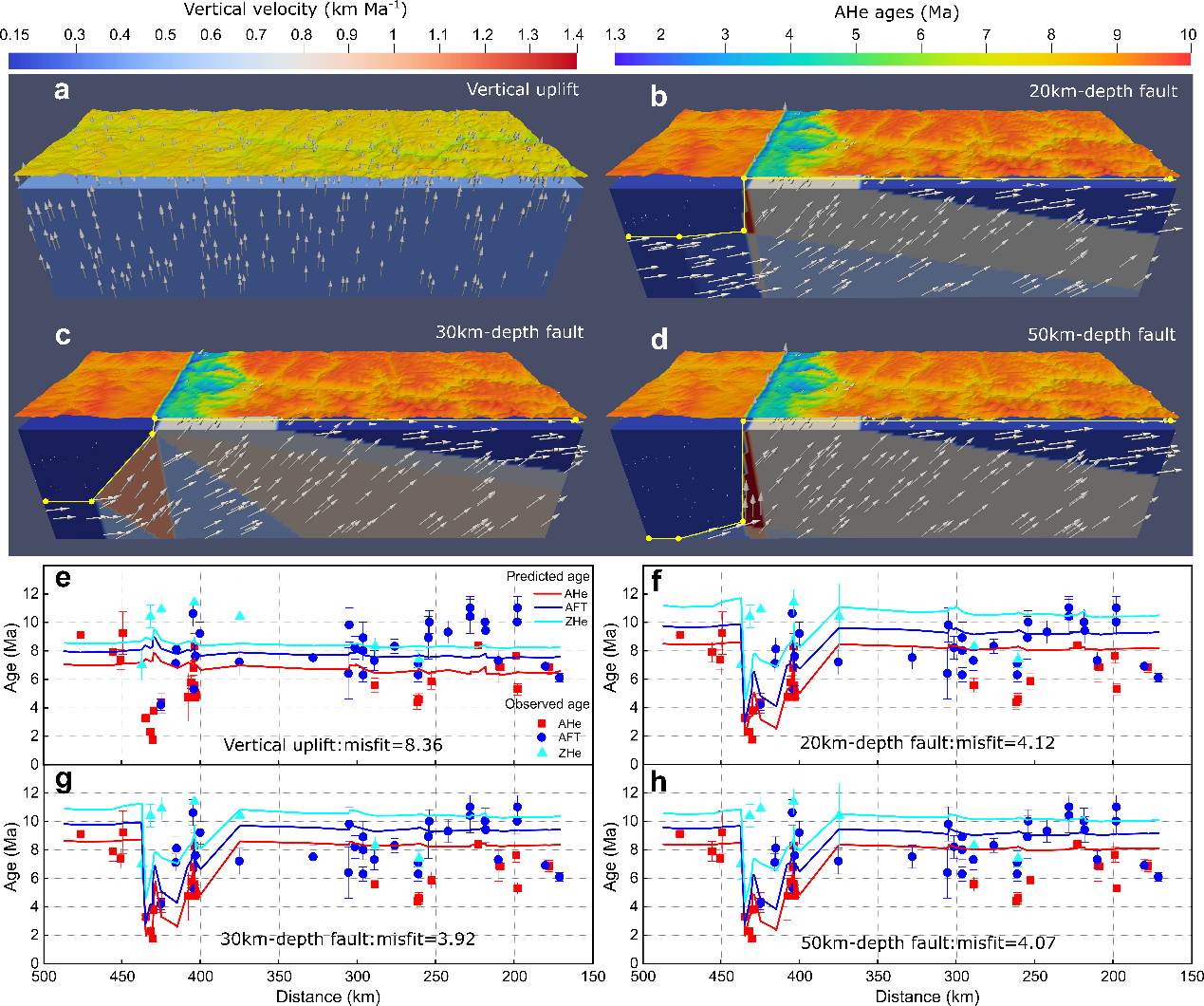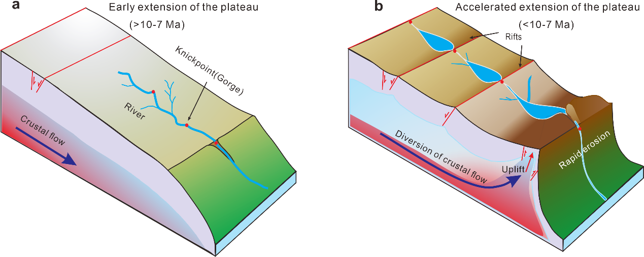 为了验证这个假说,我们沿雅鲁藏布江中游河谷系统采集了花岗岩样品,开展了磷灰石和锆石低温热年代学测试,结果显示晚中新世以来随着加查峡谷的快速冷却,峡谷上游和下游冷却速率明显减小(图 2);三维热动力学模拟结果显示高角度正断层控制了加查峡谷的快速剥蚀(图3)。晚中新世也是喜马拉雅东构造结快速剥露的时间。据此,我们认为随着青藏高原持续隆升,晚中新世开始垮塌、向外生长,高原南部、中部地堑断陷和喜马拉雅东构造结抬升活动增强,抑制了河流裂点的迁移和溯源侵蚀,使得高海拔高原面与陡峭峡谷地形得以保留(图4)。我们的研究表明,构造活动不一定总是增强河流的侵蚀,造山带构造活动的多样性也可能减小河流的侵蚀速率。这个发现也为解释世界上很多大型造山高原长期维持高海拔-相对低起伏地形提供了新的机制。