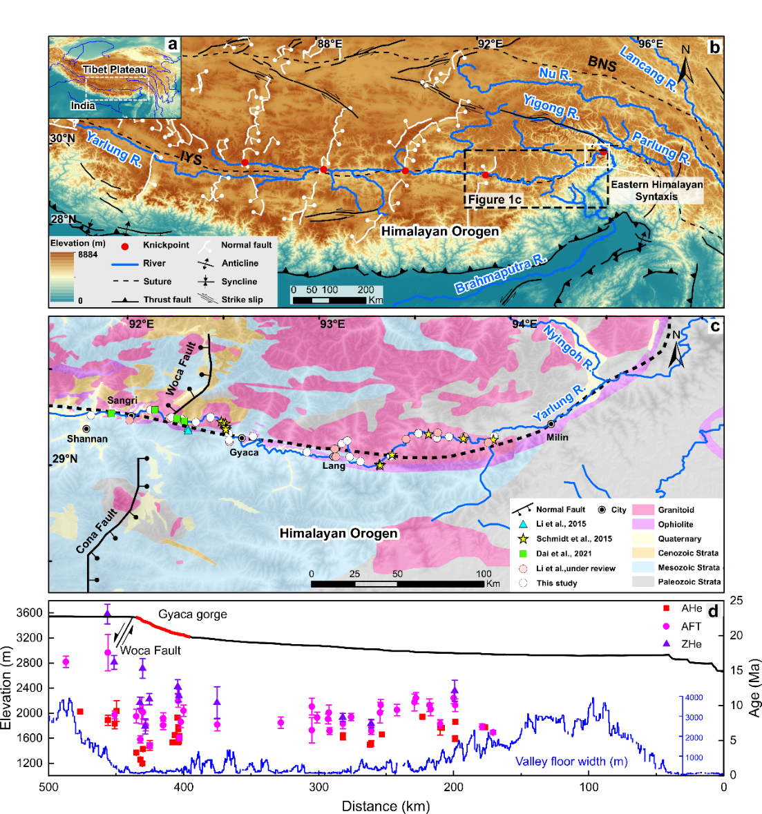 大型河流、构造活动和气候变化的相互作用塑造了活动造山带地貌。普遍接受的观点是,构造抬升增加河流坡度、导致侵蚀基准面下降,促进了河流溯源侵蚀。但是在长时间尺度上,为什么河流没有下切的更深入或者更远进入高原内部、破坏高原内部高海拔-低起伏地形?为什么溯源侵蚀的外流水系没有和高原内流水系连通?目前仍然存在争议。河流溯源侵蚀的过程中,往往会发育一系列河流裂点、形成向上游迁移的侵蚀波。很多大型河流裂点通常位于区域构造特别活跃的位置,最为明显就是青藏高原南部雅鲁藏布江,多个河流裂点发育在藏南南北向裂谷(图1)。我们推测高原抬升背景下多样活动性质的断层系统可能抑制了河流裂点的迁移,导致高原深切峡谷与高海拔-低起伏地形长期共存。