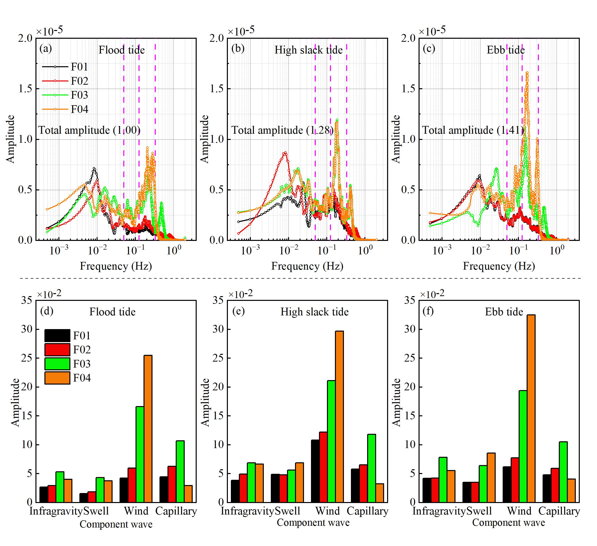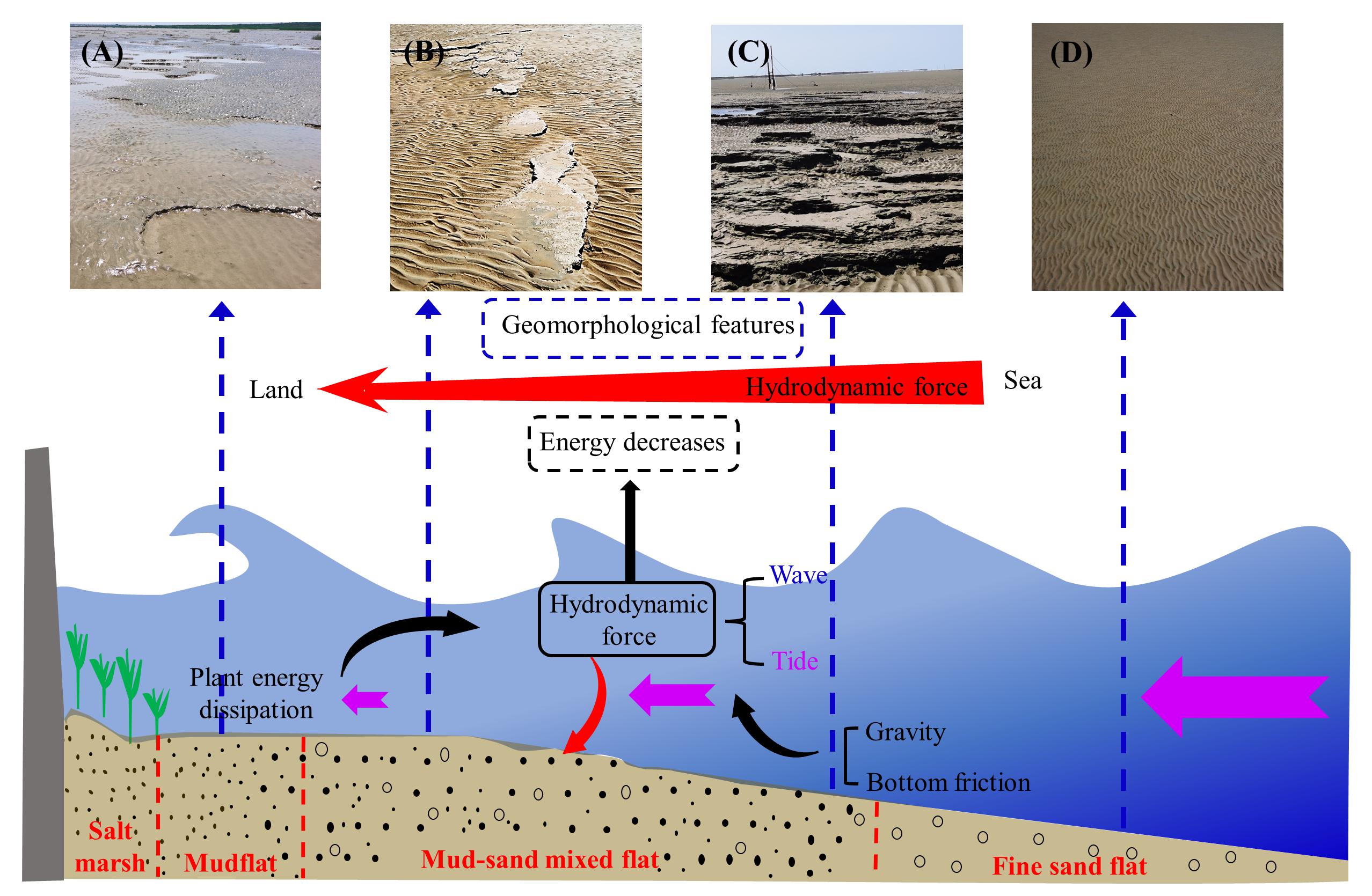 另外,为更加深入了解波浪这一被认为导致光滩、盐沼侵蚀和退化的主要因素,采用更加适用于分析非线性非稳态的波浪信号的希尔伯特黄黄变换(HHT)方法评估波浪在盐沼-潮滩系统中的衰减和时空变换,发现盐沼植被在潮滩中具有最高的波浪能量耗散能力。在高浊度潮滩中,潜在的浮泥层对波浪的衰减起着重要作用;入射波传播过程中低频的次重力波成分会被逐渐释放,并在向岸移动过程中保持稳定的增强趋势;波浪特性的时空变化受到潮流的强烈调制(图3)。这为潮滩上各种波浪组分的行为、变换以及对潮滩演化的驱动作用提供了新见解,并为进一步建立更为切合实际的潮滩沉积物输运和几何形态模型提供了重要约束边界条件。
