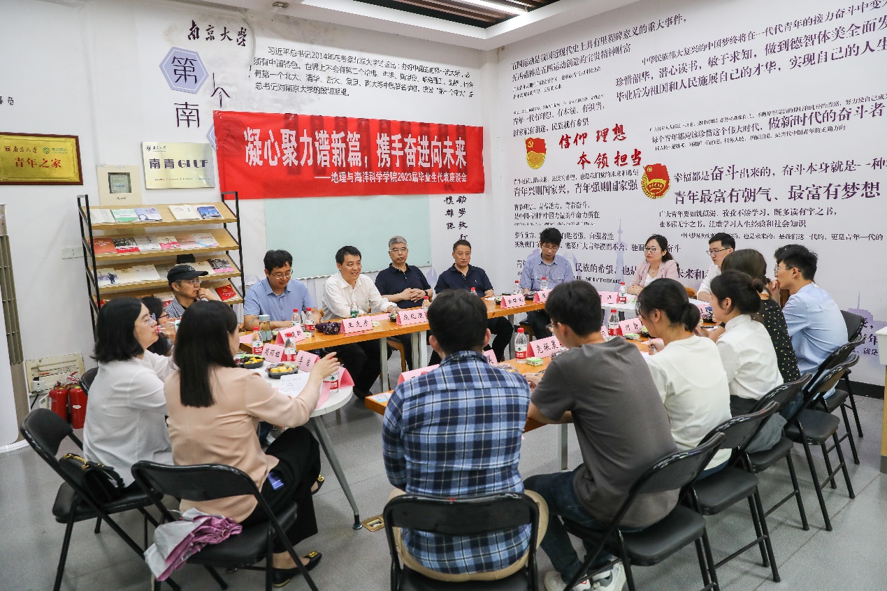 活动伊始,毕业生代表依次做了交流发言。博士毕业生代表徐伟义首先表示,毕业既是终点也是新的起点,正是学院的精心培养,才让我们有了奔赴下一站的信心和底气。硕士毕业生代表王佩玉、栾文博、何静,也就求学期间的收获与成长、历练与提升发表感言,并表示将以南大地理人的“底气、锐气、勇气”在未来的学习和工作中保持“奋进”。本科毕业生代表俞玥、尧振晨、陈崇昊、王泽霖表示四年大学时光丰富多彩,地理学院给予了同学们全面发展的宝贵机遇,同时也表达了对学院和老师们的感谢及对未来的美好期许。同学们一致表示,在南大地理学院的求学过程中,收获了丰富的知识和成长,切实感受到了地理学院的重视和关爱。在轻松愉快的氛围中,同学们对研究生学业预警机制、国际科考、野外实习、学院公共空间建设、专场招聘会等方面提出了期望与建议。