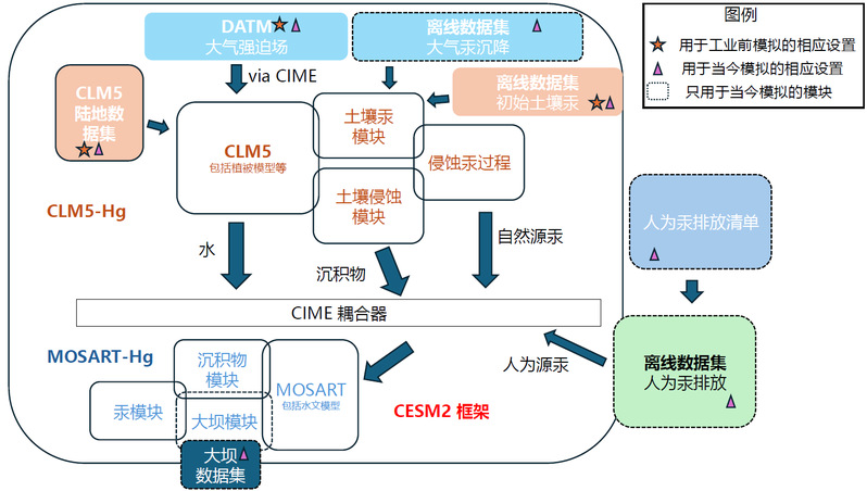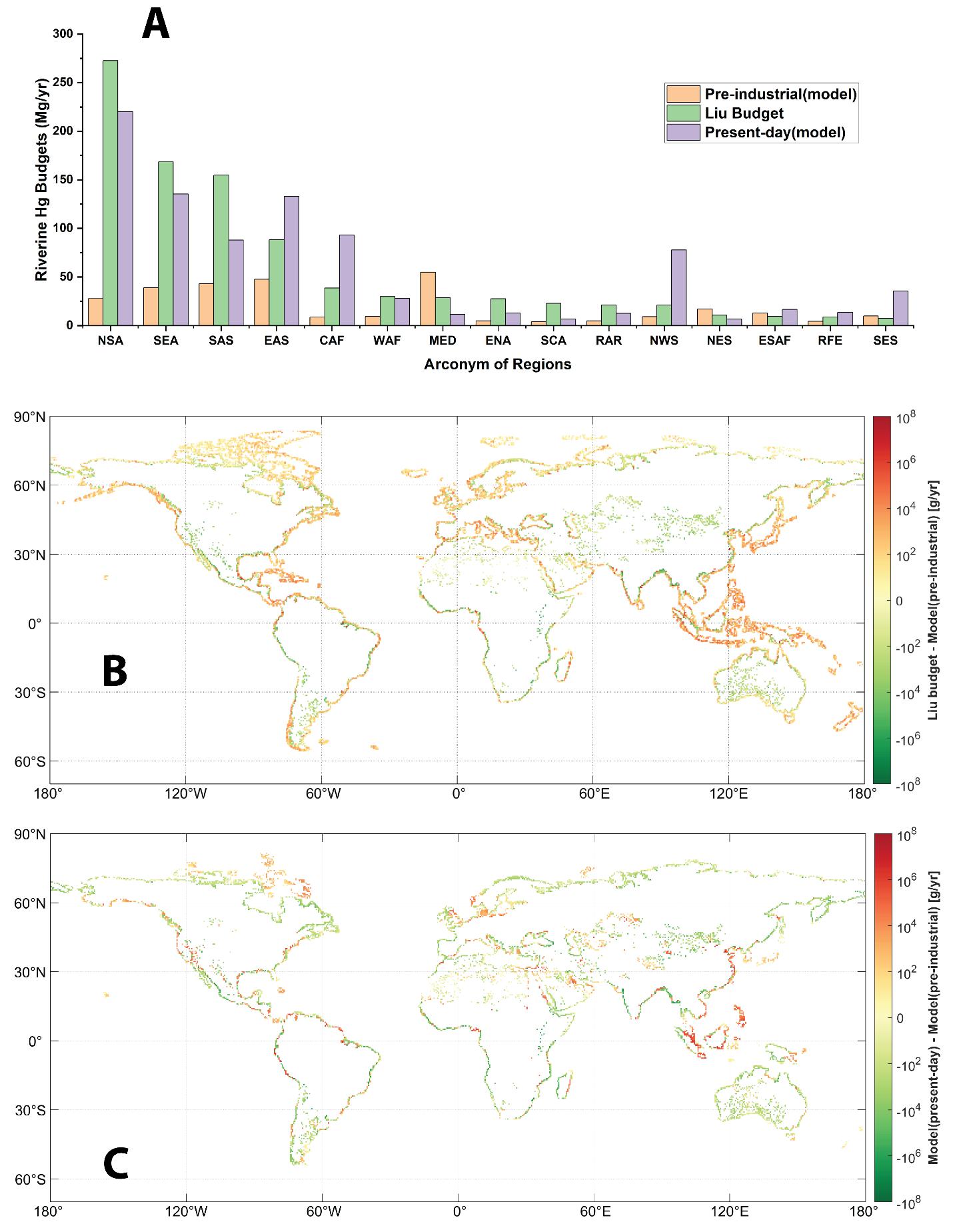 汞化合物是一类强效的神经毒素,主要通过食用鱼类威胁人类健康。河流不仅是饮用水和食物的重要来源,自工业革命(约1850年)以来,其汞浓度和向沿海地区的输出量也显著上升。然而,这一变化的时空格局尚未被系统研究,限制了对相关环境政策成效的评估。近日,bl动漫 与大气科学学院联合课题组于国际刊物Science Advances发表题为“Human perturbations to mercury in global rivers”的研究论文。该文基于地球系统模式CESM2与E3SM开发全球河流汞模型,采用工业前时期气象驱动场来模拟工业前时期的河流总汞通量,并通过与现代观测估算和模拟进行深入对比,系统量化了近现代人类活动对河流汞循环的扰动。