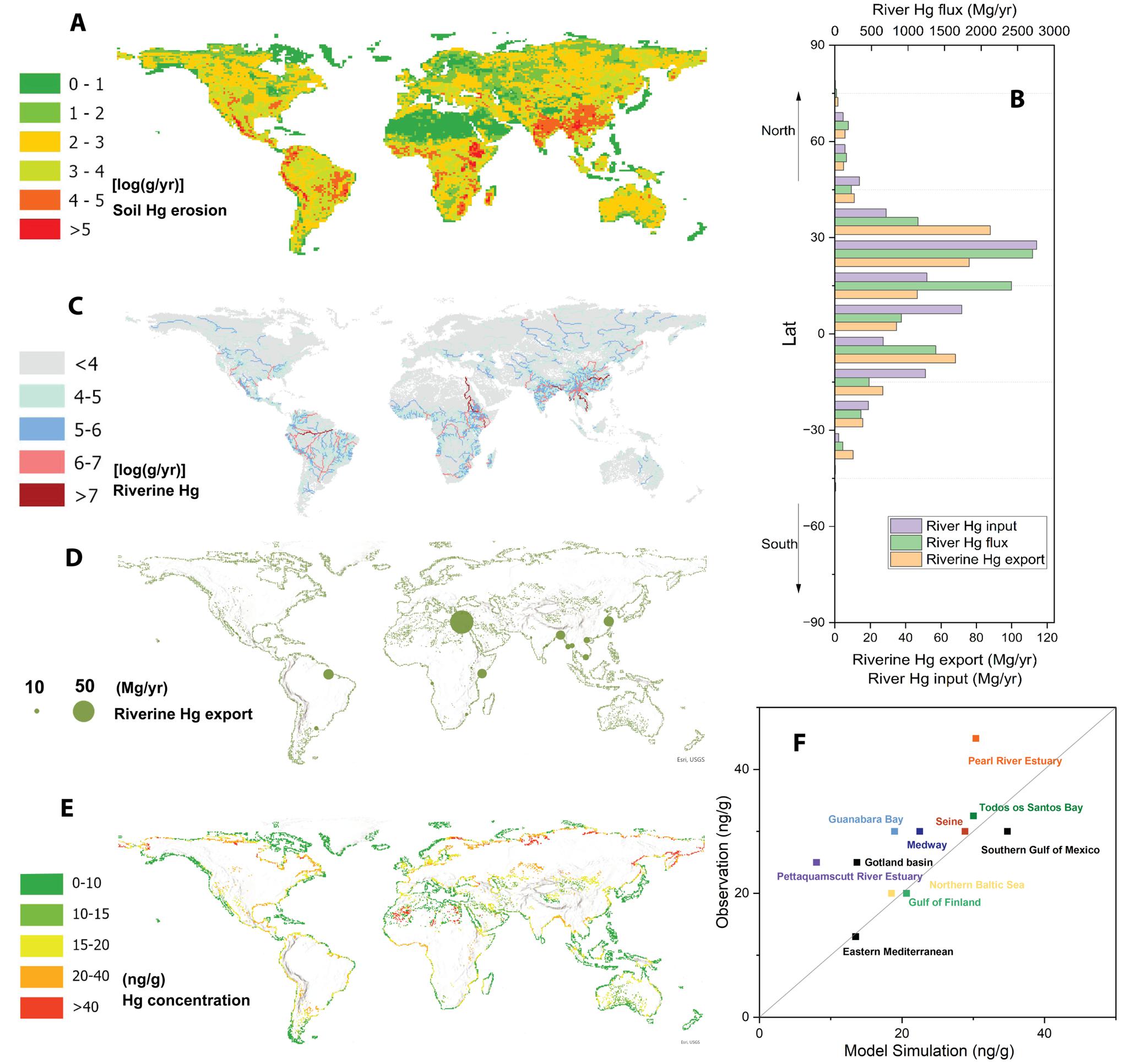 与此同时,东亚地区河流汞负荷的增加主要归因于工业排放,相比之下,一些河流流域由于水库建设导致泥沙和汞被滞留,当前的河流汞输出甚至低于工业前水平。例如,尼罗河流域受阿斯旺高坝等水利工程影响,出现了汞输出的显著下降。区域间汞输出的变化存在显著的空间异质性,不同扰动源(如土法炼金与工业排放)在各地区的作用机制也存在差异。值得注意的是,在观测数据稀缺的地区(如中非、东南亚部分流域),模拟结果与统计估算存在一定差异,强调了加强监测和提升区域观测能力的重要性,以更准确地评估全球河流汞污染现状与变化趋势。