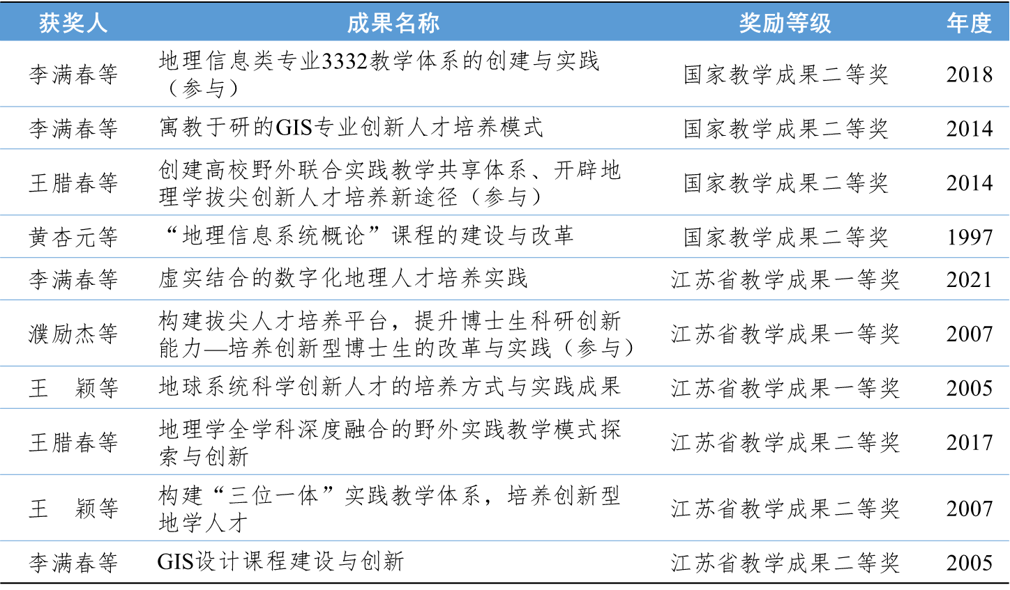学院积极开展地理学教学改革探索与实践,总结教改成果,获得10项省级以上教学成果奖。其中,国家级教学成果二等奖4项、省级教学成果奖6项(含一等奖3项)。这些成果涵盖专业教学体系、创新人才培养模式、野外实践教学、课程设计与改革等方面进行了有益的探索,并得到应用推广,在业界产生了深远影响。