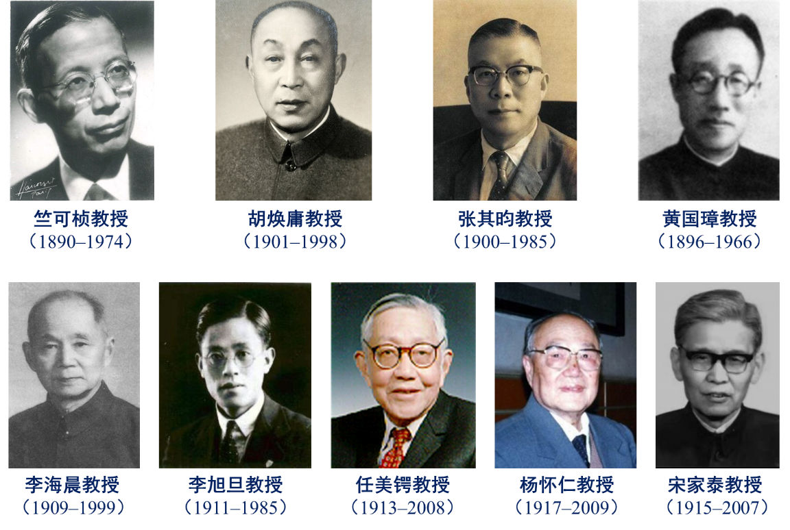 竺可桢先生,地理学家、气象学家、教育家。1918年获得哈佛大学博士学位,1920年受聘于南京高等师范学校,1921年在国立东南大学创建地学系,在校期间曾讲授地学通论、气候学和世界气候等课程,还发表了有关东亚季风(见1934年《地理学报》创刊号的第一篇长文)、台风、历史气候变迁和《新地学》等论文和专著。先生为培育地学英才,延聘名师,充实图书仪器、编著教材,开展科学研究,使地学系发展充实,声誉日隆,受到学界重视与赞誉。1936–1949年担任浙江大学校长,1949年起任中国科学院副院长兼任地理所所长(1950–1953年)、中国科学院自然资源综合考察委员会主任(1955–1970年)、中国地理学会理事长(1953–1974年)。首创区域气候研究,确立气候区划和自然区划的基本轮廓,研究中国近五千年的气候变迁,是我国物候学研究的奠基人。领导和组织我国自然资源科学考察,是青藏高原、黄土高原、西北荒漠、中国沙漠、东北黑土系统考察的奠基人,是中国科学院资源与环境类多个研究所的实际创始人。