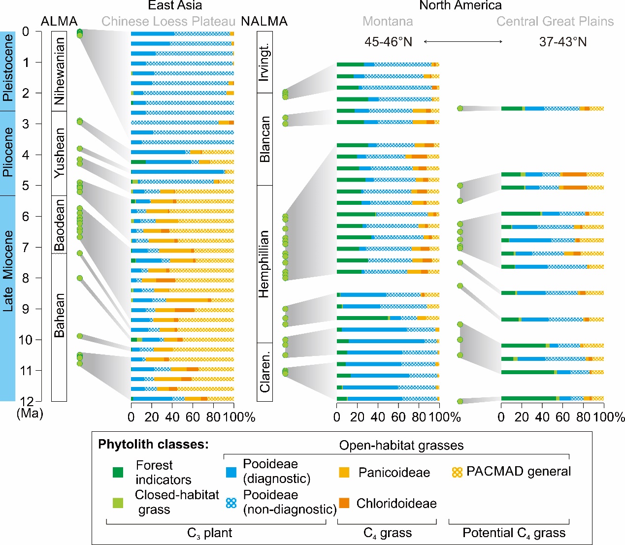 他们总结了全球各个大陆草原、C4植被扩张历史。基于上述现代禾本科与气候的对应关系,尝试利用植硅体组合重建古气候,探讨气候演变驱动机制。研究结果指出,东亚和北美地区的草原大约在两千万年前同时出现,这些早期的草原生态系统很有可能是由C3早熟禾亚科主导,C4植被的扩张都是基于高度异质性的植被组成。北美地区的C4扩张是虎尾草亚科约在8~5 Ma的逐渐兴起, 区域范围的干热气候可能是主要驱动因素。东亚地区的C4扩张是黍亚科约在~11 Ma的逐渐兴起,亚洲季风演化可能是主要驱动因子。