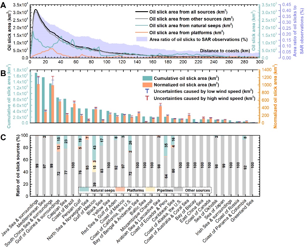 图2 全球海面油膜距岸分布直方图(A)、各海区油膜累积面积和归一化面积(B)及不同来源油膜占比(C)。