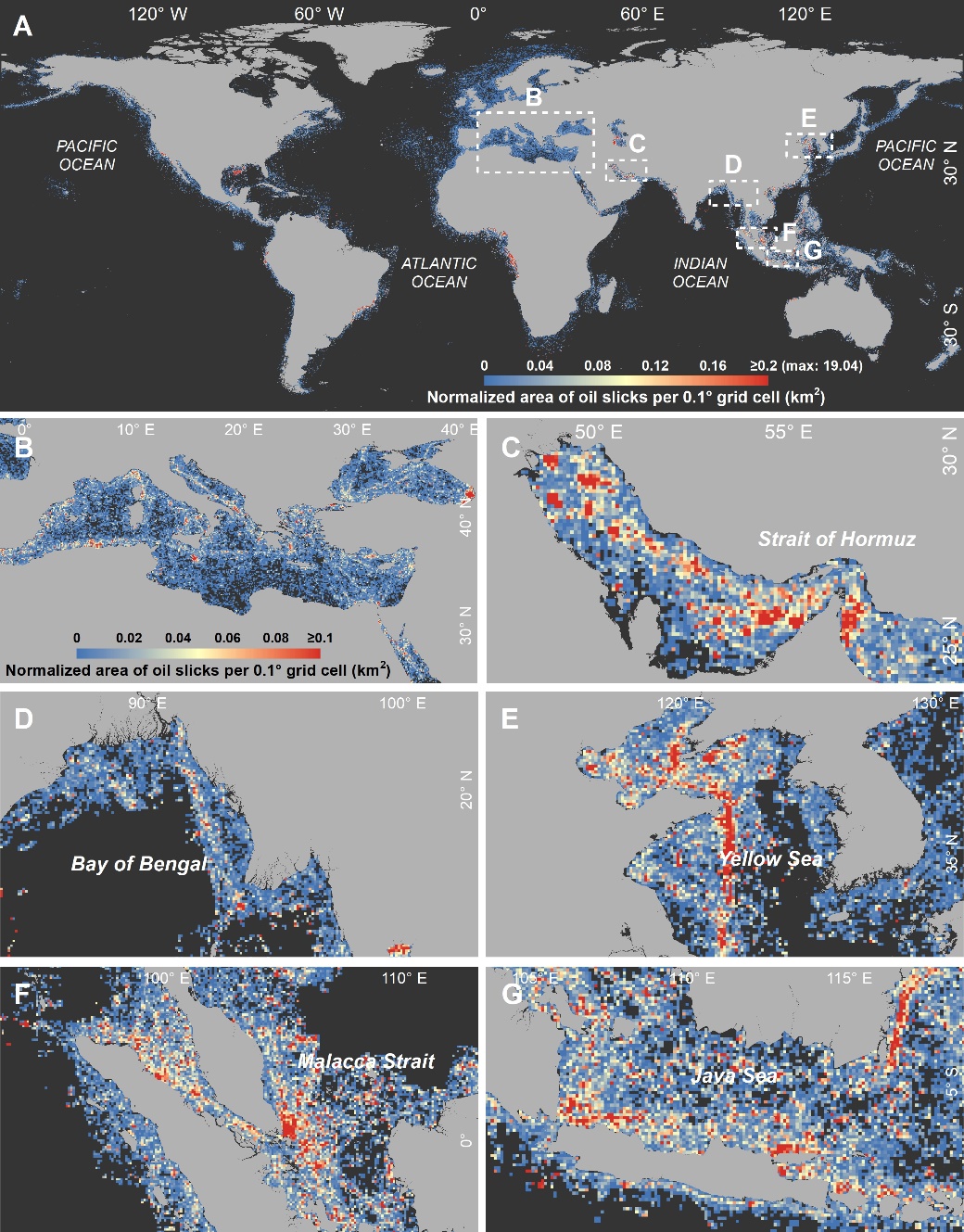 图3 全球海面油膜空间分布(2014–2019)。A: 油膜归一化面积(0.1°×0.1°格网);B–G: 检测到的高密度溢油污染带。