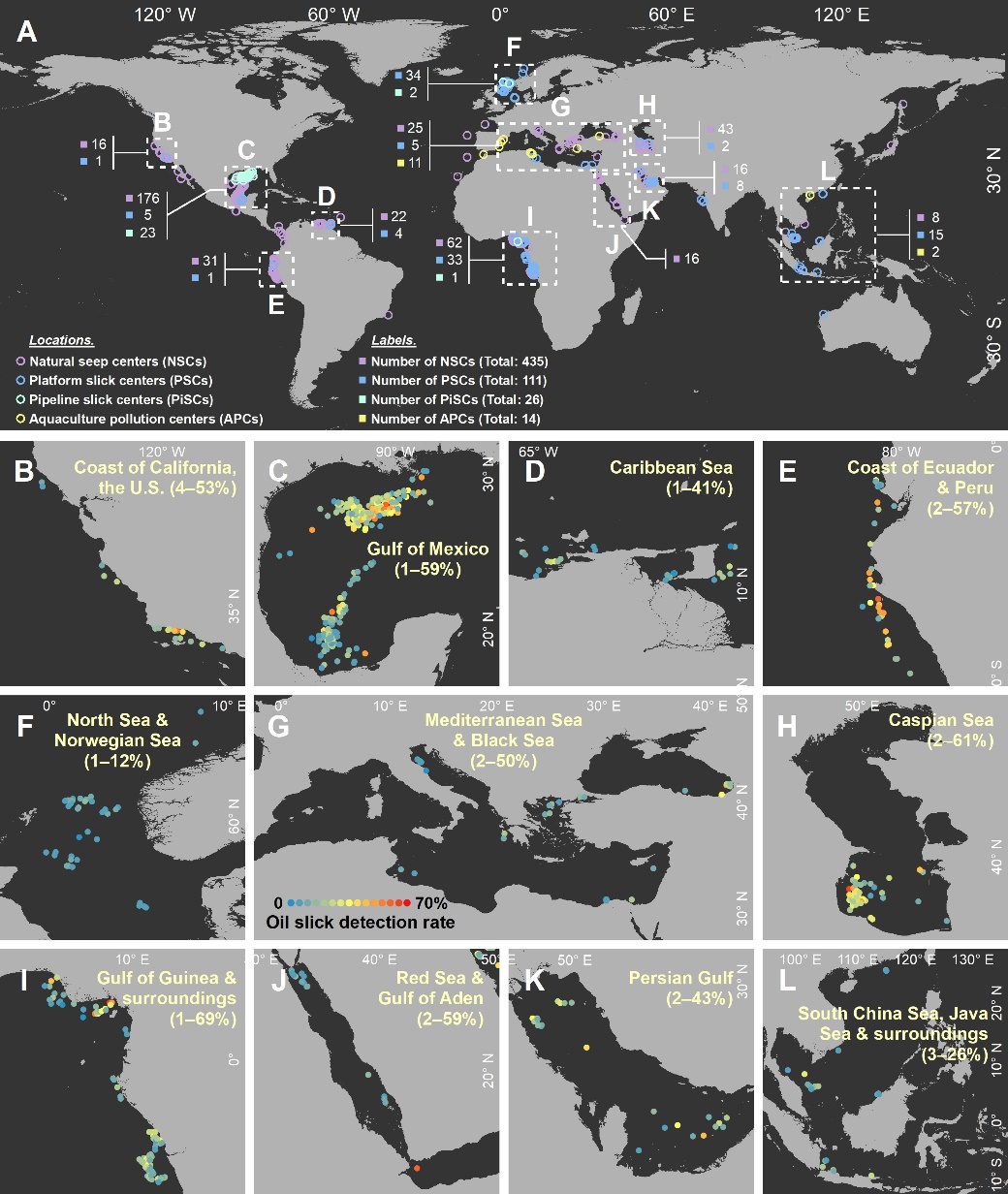 图4 全球海面油膜聚集中心分布。A: 天然渗漏中心、油气平台/管道油膜中心的全球分布;B–L: 各区域放大图(括号内数字表示各聚集中心的油膜检测频率范围)。