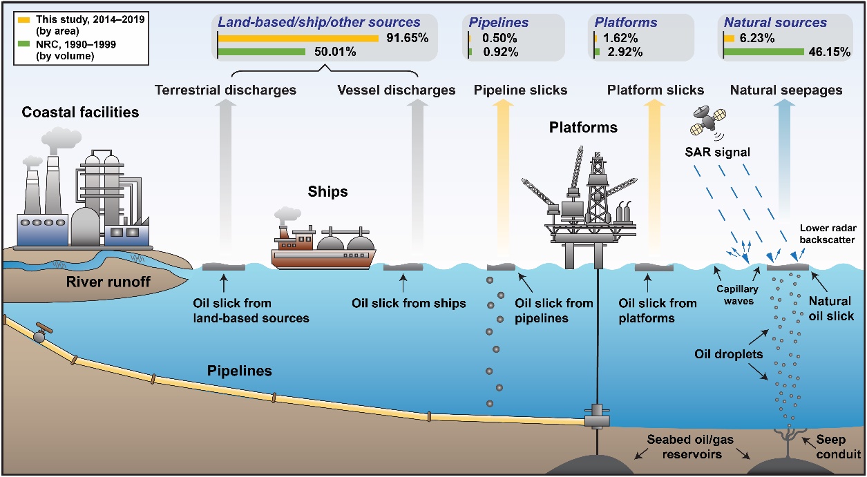 图1 海面油膜来源(天然烃渗漏、油气平台/管道、船舶及陆源排放)与贡献。