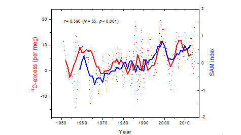 图2 过去几十年南极Dome A雪坑17O-excess记录与南半球环状模(SAM)指数之间的关系