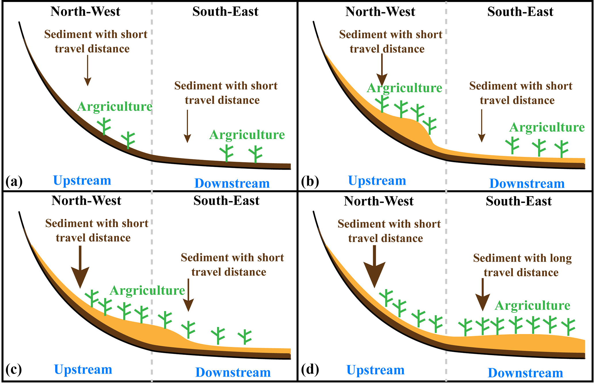 同时,通过对比流域沉积物厚度模拟结果与古人类活动遗址的空间分布情况(图3),我们借鉴生态学领域中的“生态位构建理论(Niche construction)”,提出了人类活动热点区域与河漫滩发育之间相互作用的观点,解释了河流系统发生突变的原因:早期河流堆积过程产生的河漫滩为人类提供了生产生活场所,使得早期人类活动集中在流域西北部。此时,土地利用变化的主要类型是草地转化为农作物,河流系统响应的敏感度降低。随着人类活动导致的泥沙量增加,河漫滩由上游向下游扩张,人类生产活动中心转移至流域东南部。土地利用变化以森林转化为农作物为主,导致河流系统响应的敏感度上升,发生系统突变(图4)。