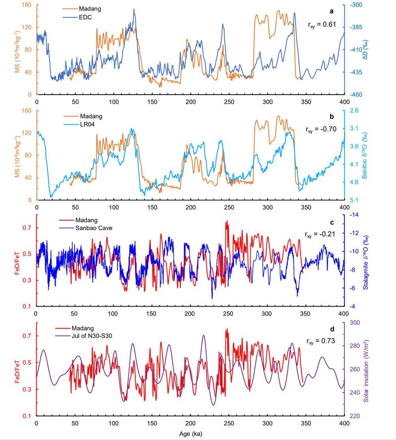 磁化率通常指示成壤强度,一般受降水与温度的共同影响。如果马垱剖面的磁化率主要是降水的代用指标,则需要引入起到信号平滑作用的沉积后过程解释,通过其消除2万年的周期。更加可能的解释是,马垱剖面的黄土磁化率主要反映了温度的变化,其与南极温度记录呈明显的正相关(图3)。推测是温度升高有利于蒸散发作用,从而降低了土壤湿度,避免黄土发生还原而导致磁化率降低。