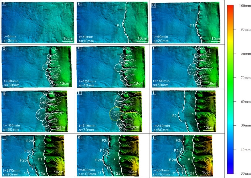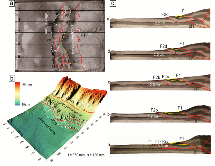先前研究大多基于构造几何学、气候和地貌的综合分析推断其形成过程,缺乏构造地貌的动态演化过程和机制的探讨,而模拟能够为这一问题的解决提供必要途径。最近,bl动漫 李一泉副教授和硕士生毛宇琼等通过构造地貌物理模拟实验,采用水饱和的材料,为更精细尺度的地表过程作用下褶皱冲断带的演化提供了新的视角(图1,2)。该研究设计了多组物理模拟实验,通过三维扫描仪获取地貌的动态演化过程,定量探讨了有无塑性滑脱层和不同地壳缩短速率下,褶皱冲断带地表过程对构造缩短的响应及其对构造发育的影响。相关研究结果发表在国际知名学术刊物《Tectonics》上。